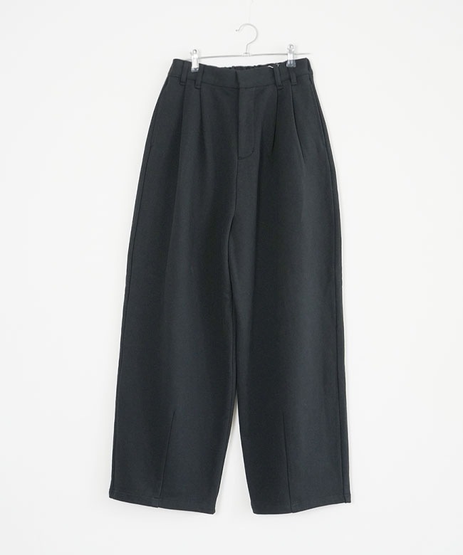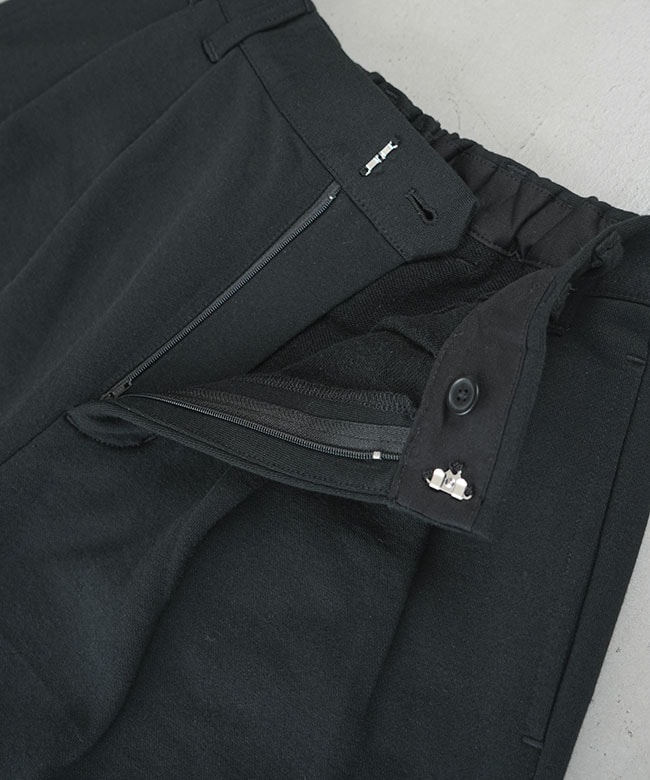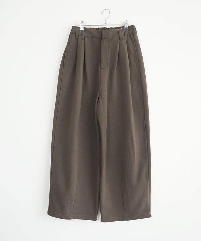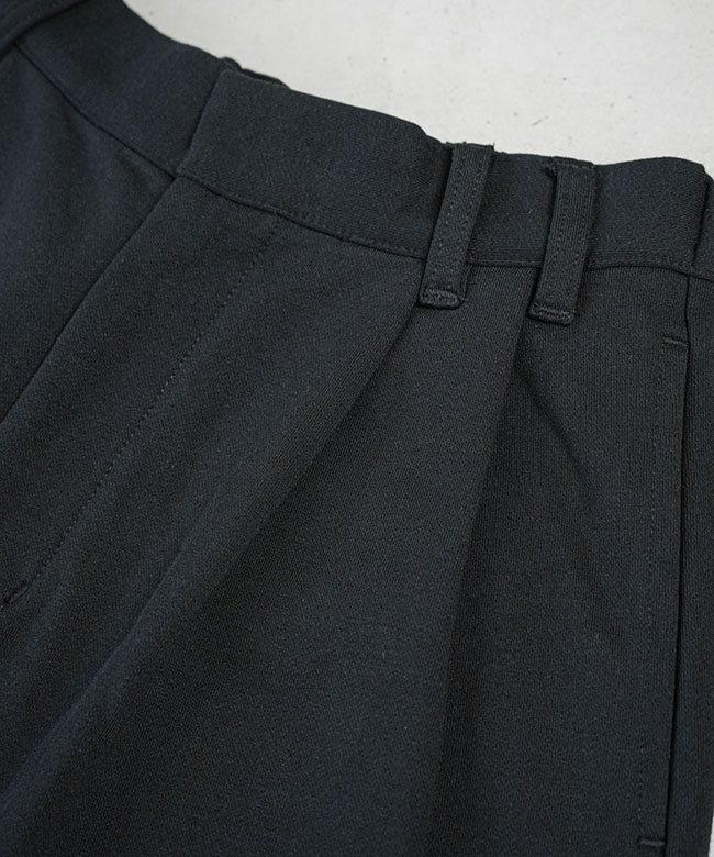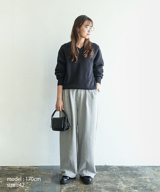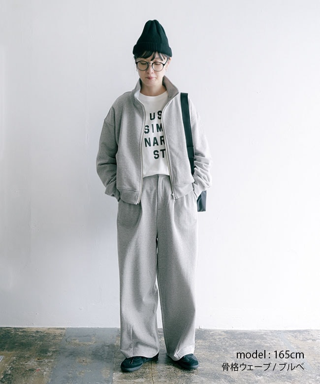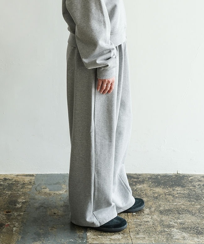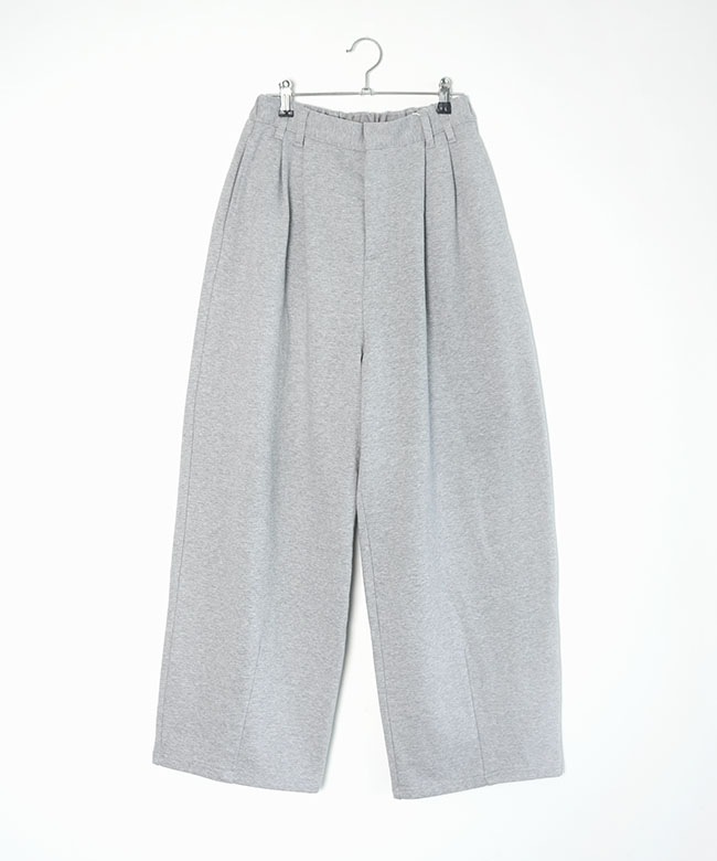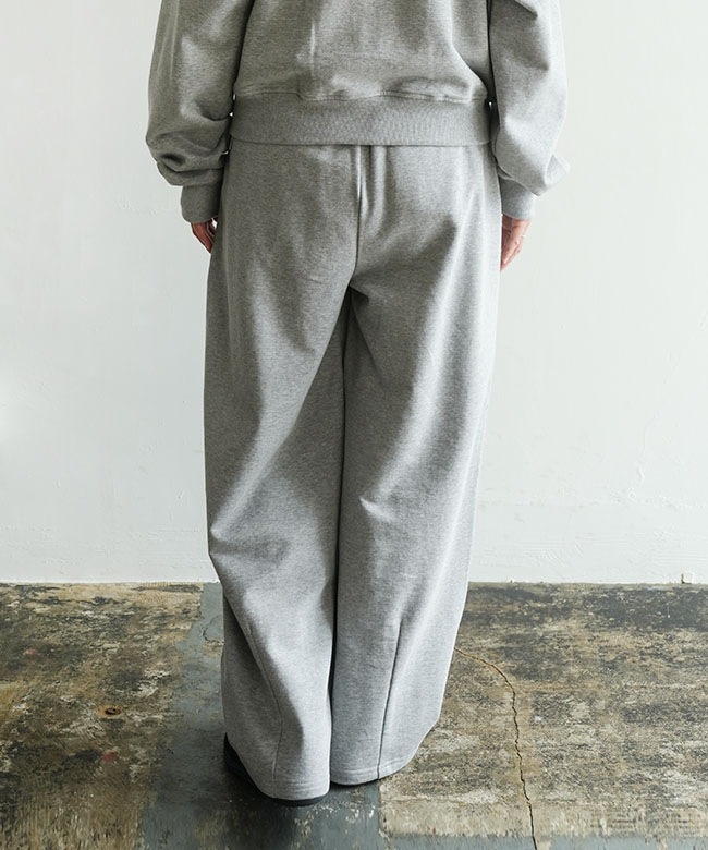 きれいめタックパンツのデザインをそのまま継承することで、スウェットの部屋着っぽさを感じさせない、ファッション性の高い一本に仕上がりました。