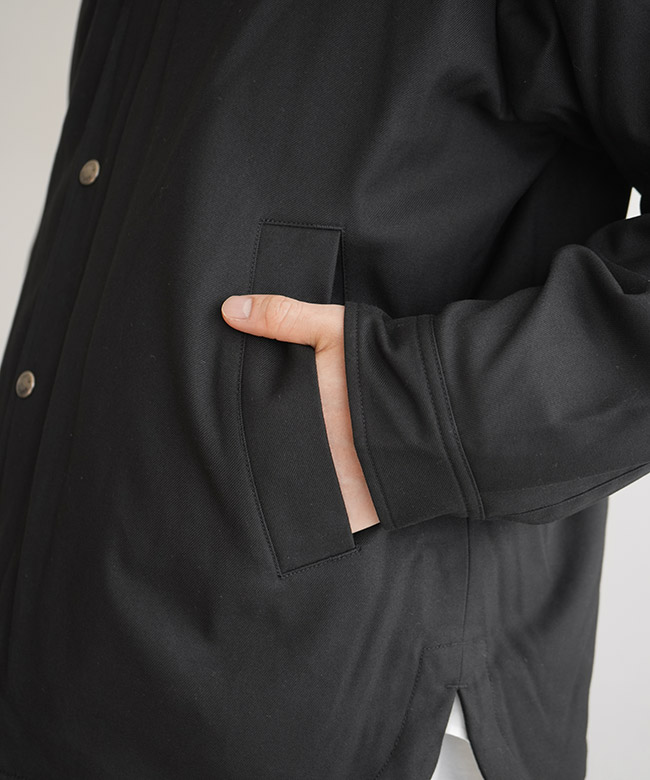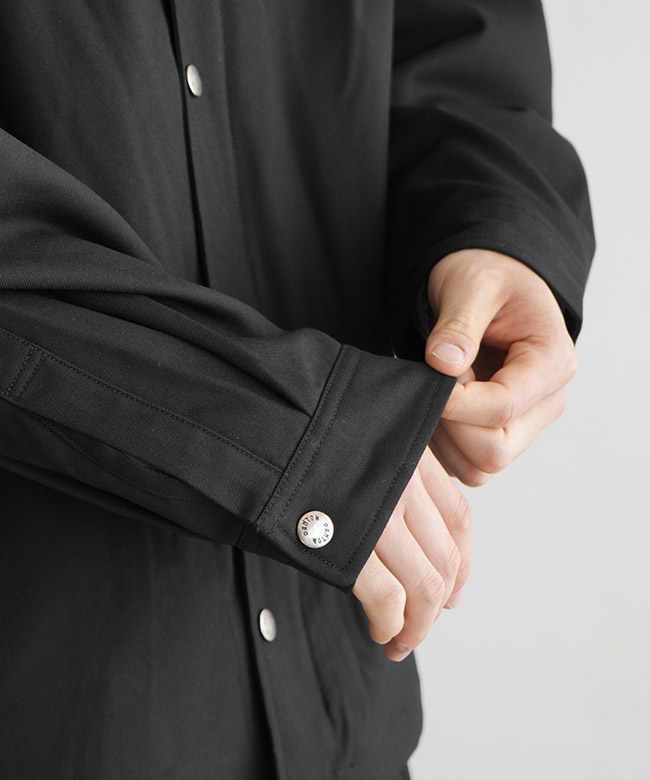・フロントはコーチジャケットらしいルックスのドットボタンに加えて比翼仕立てでジップも配しており、より防風性と保温性を高めた設計です。