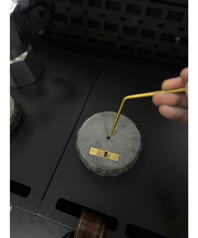 ナグリ模様のモルタル土台+真鍮のアクセント モルタルならではの重厚感がありながら、直径10cmのコンパクトサイズで、デスクやテーブル上でも安定感を発揮します。