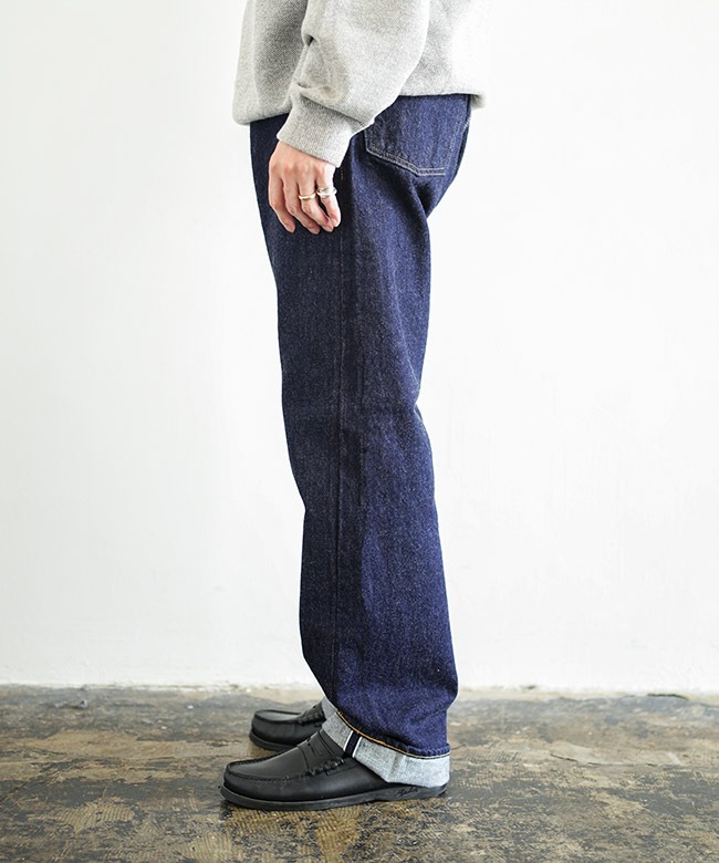 ・ワタリから裾までにゆとりを持たせたやや太目のワイドシルエットに設計されており、合わせるアイテムを選ばない万能の一本に仕上がっています。
