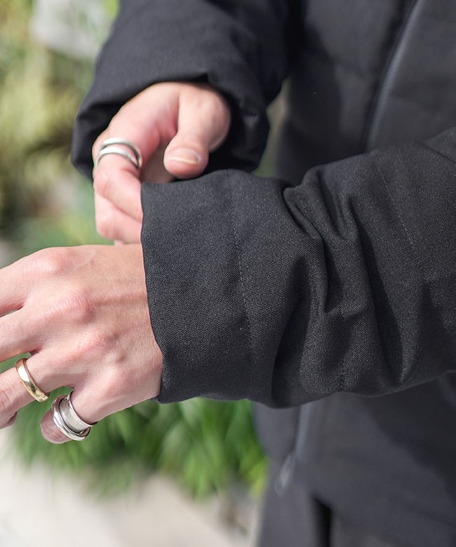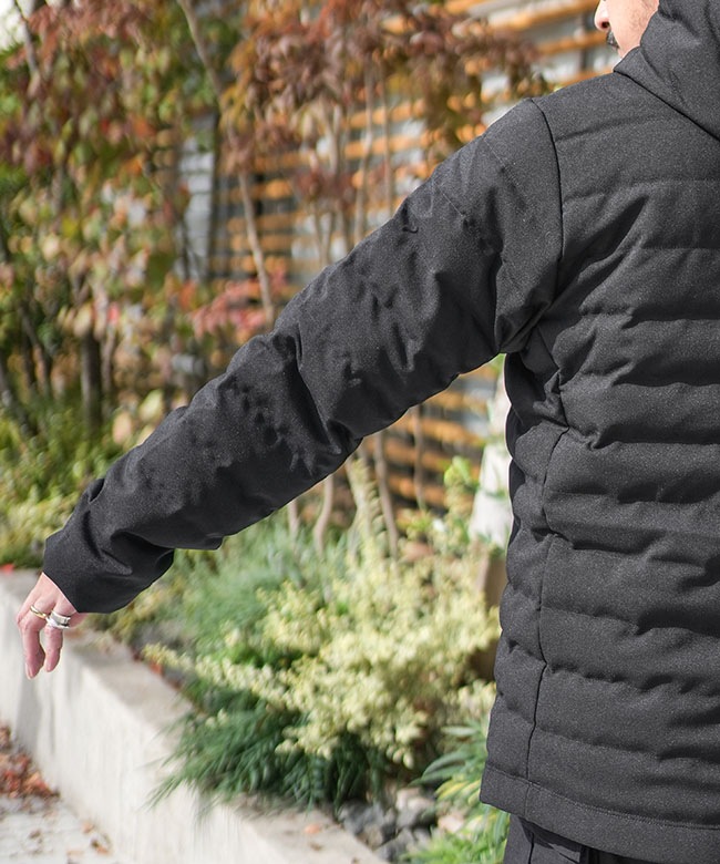 ・首元を包み込むように立ち上がったフードデザインで、フロントファスナーを閉じれば防風性・保温性をより高めます。