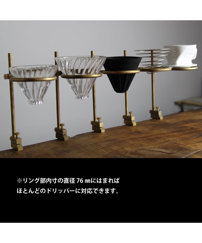 ドリッパーを装着する真鍮製のリング部は、 上下、前後に可動することができるので、 サーバーはもちろん背の高いピッチャーや マグカップ、グラスなど様々な大きさ、 高さに対応することができます。