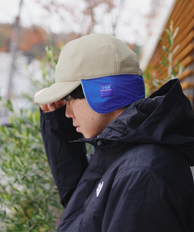 ・耳当て部分には風を防ぐナイロンタフタ素材を重ね、耳に当たる内側をフリースにすることで寒さ対策もばっちり。