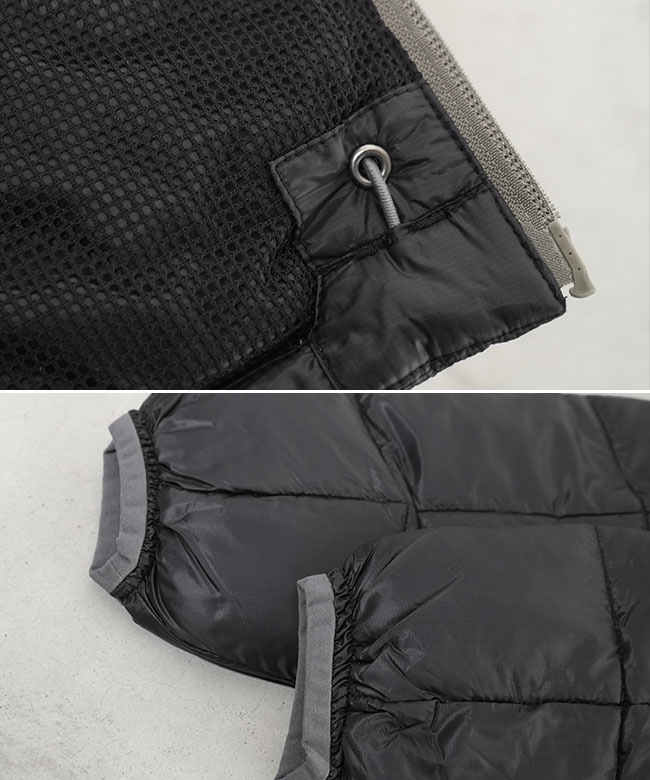 | 素材 | 表地:ナイロン100% 裏地:ナイロン100% 中綿:ポリエステル100% 内衿部分:ポリエステル100% メッシュ部分:ポリエステル100% >>素材・生地・加工についての詳細はこちら |