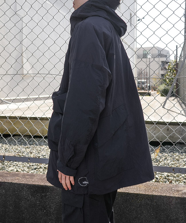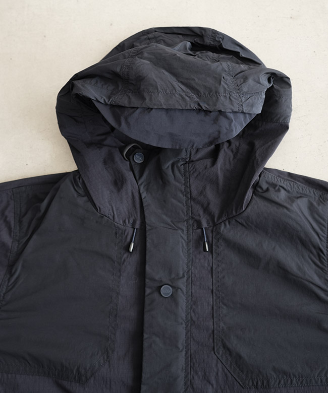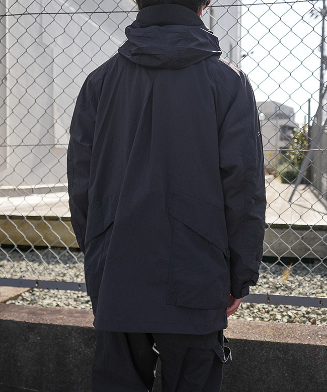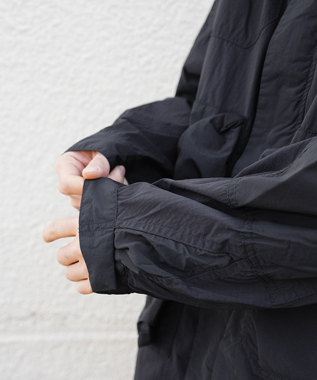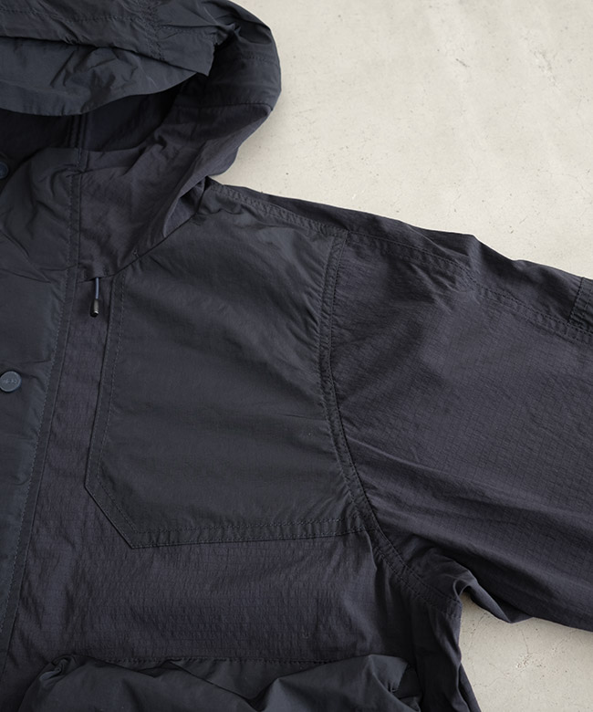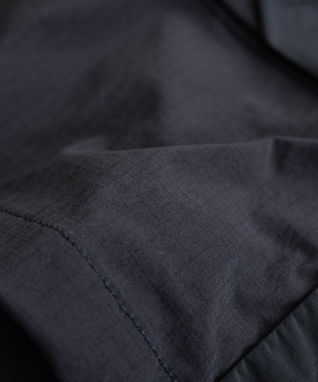 ・肩~胸、肘~袖といった、擦れやすい部分にはストレッチ性のないナイロンリップストップを使用。生地の特性を部分ごとに使い分けることで耐久性を確保しています。