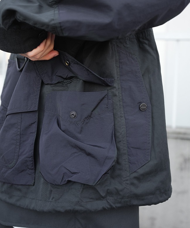 ・wfeldらしいハンティングジャケットやワークウェア由来の多彩なポケットデザインや身頃内側のストラップなど、デザインと実用性を高いレベルで両立させています。