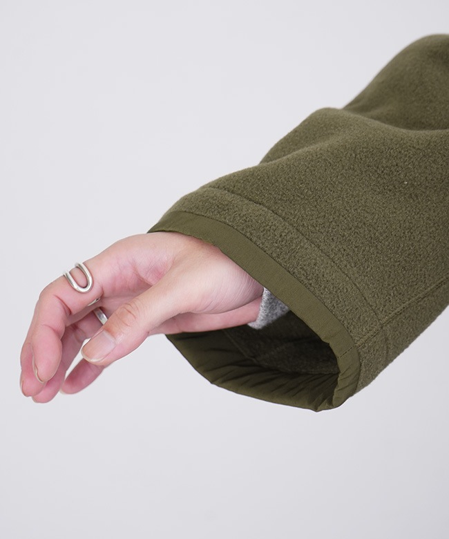 ・ややゆったりとしたリラックスシルエット。襟を立てて裏側のストラップを留めることでシルエットを変化させ、首元の保温性を高めることができます。