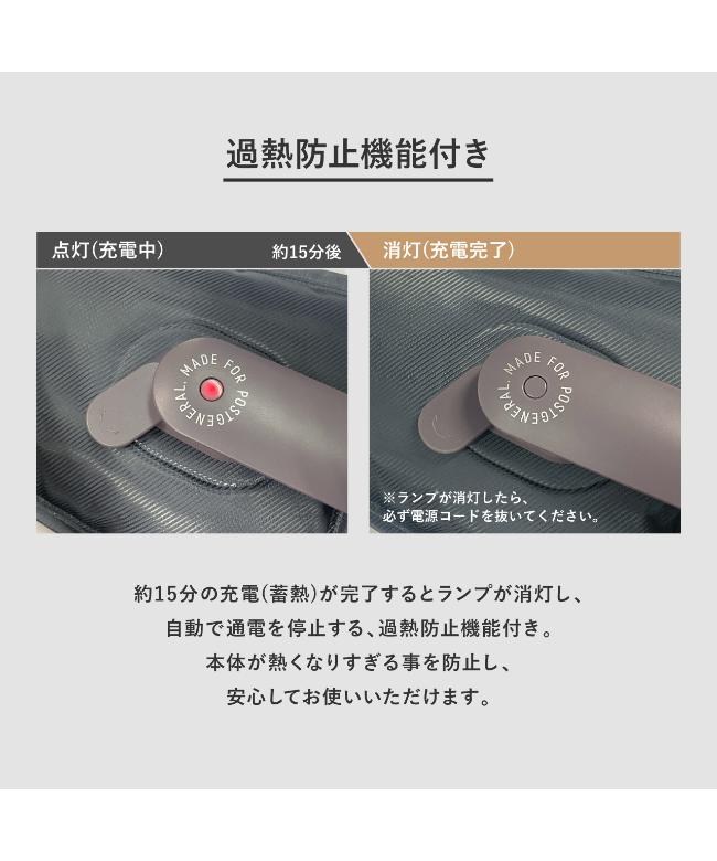 蓄熱後はコードレスで持ち運べるため、布団の中やリビングでのリラックスタイム、車やアウトドアなど、様々なシーンで活躍します。
