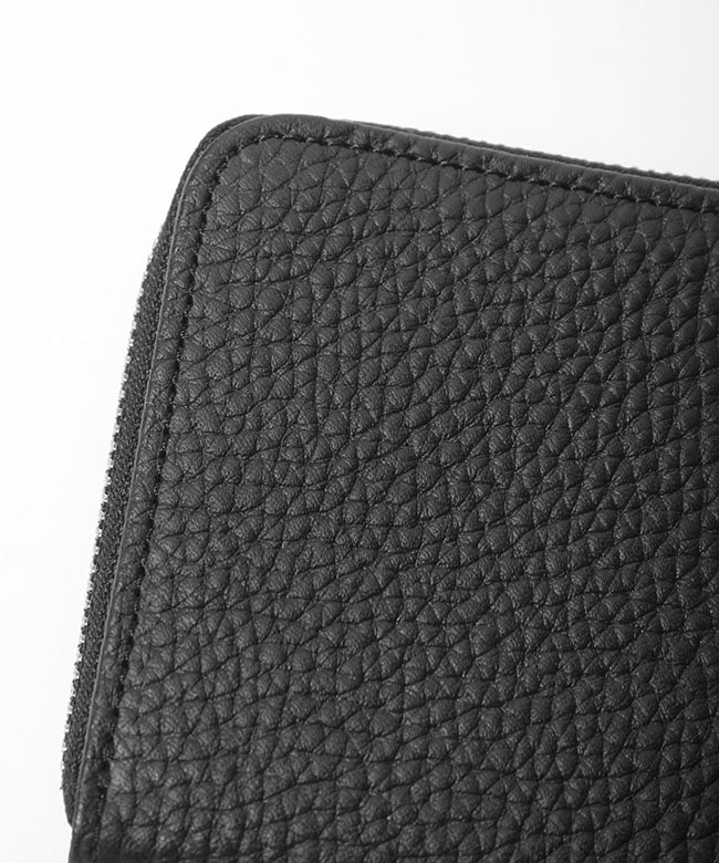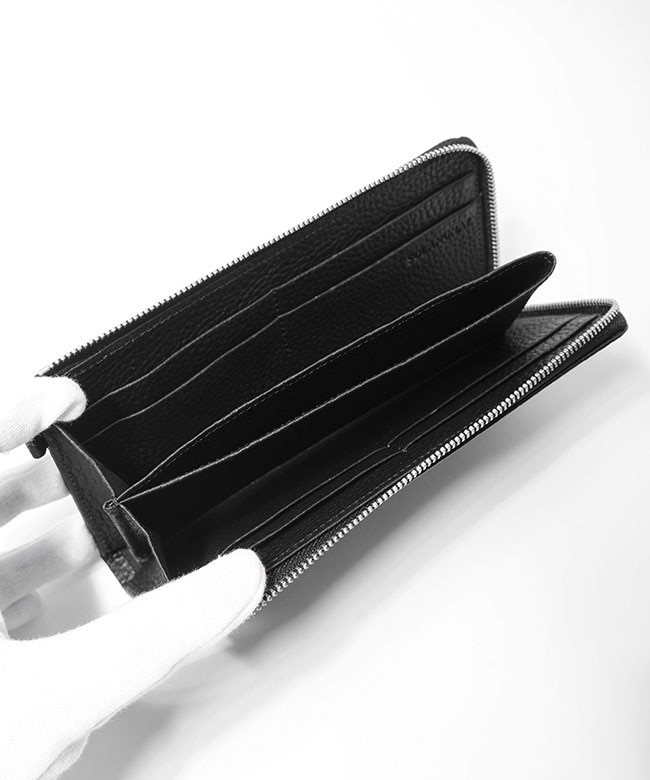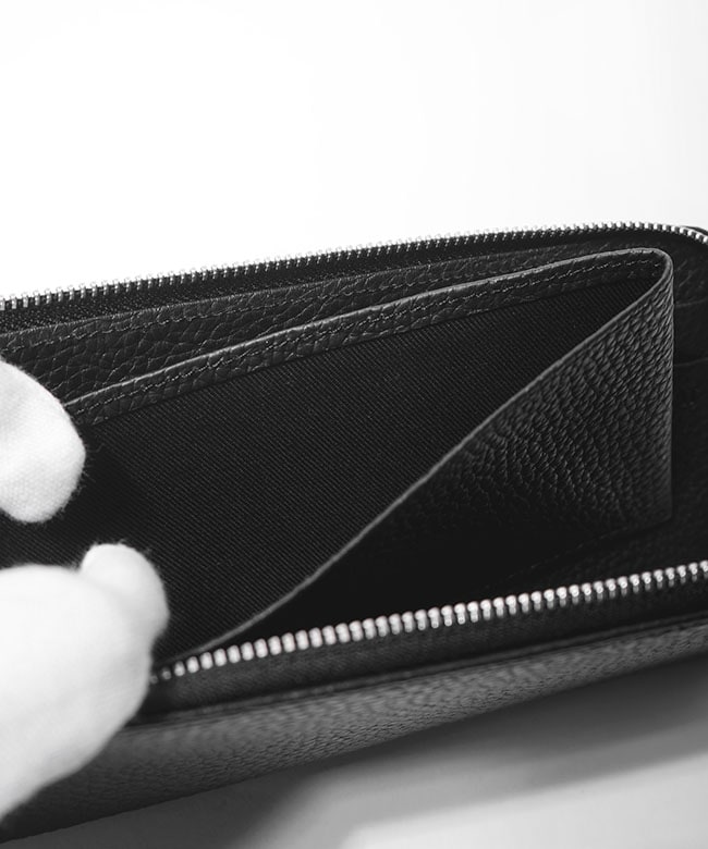 ・かさばらず、スマートに使えるL字ファスナー。がばっと開くので内部を一目で見やすく、出し入れも簡単です。