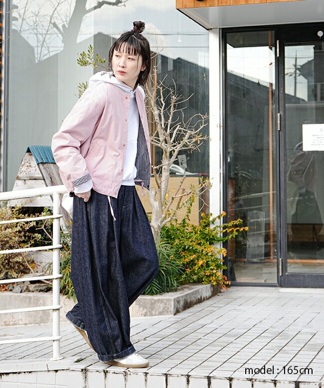 ・ゆったりとした身幅で、スウェット生地など厚手トップスにも重ねられます。