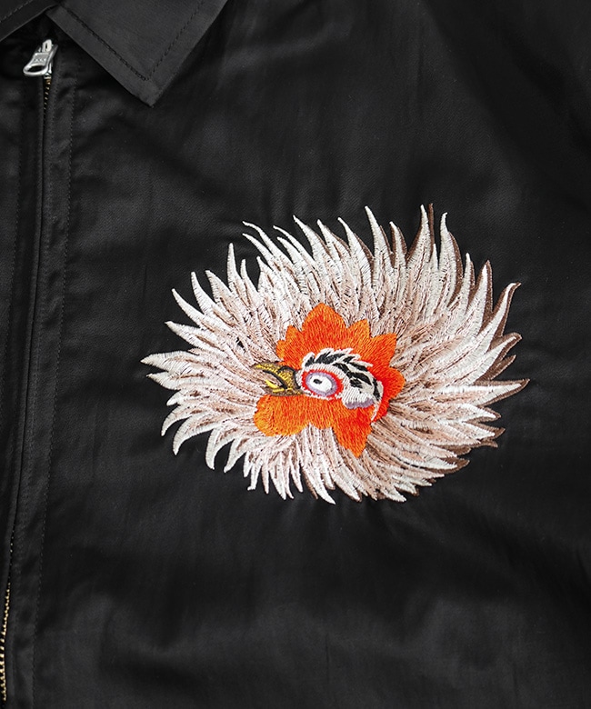ジャケット全体に施された精緻で豪華な刺繍モチーフは、江戸時代の日本絵師のような構図と雰囲気を描き出し、唯一無二の存在感を放ちます。