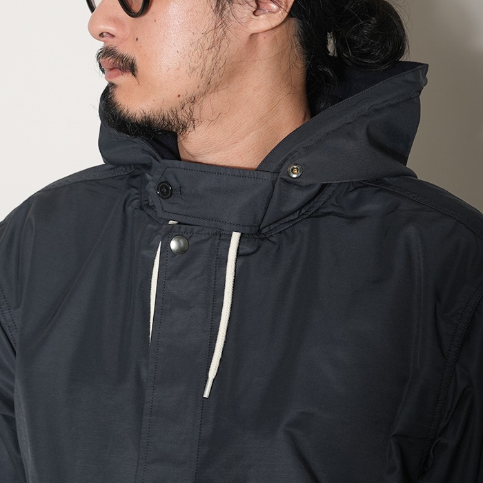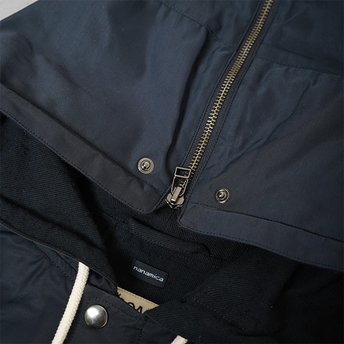 フードは中央のファスナーにより、左右に分かれる遊び心を感じるデザインで様々な着方が楽しめる一着。