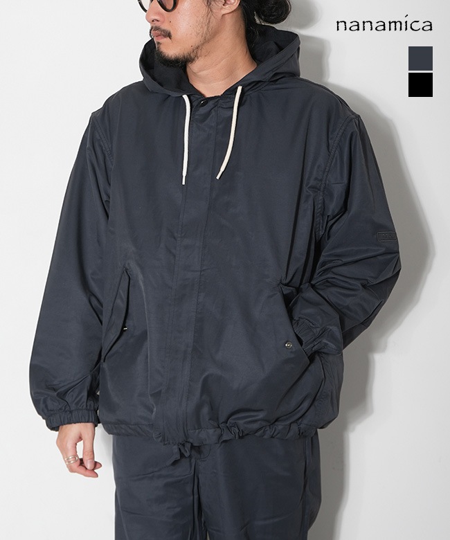 リサイクルナイロンツイルを使用したフーデッドジャケット。