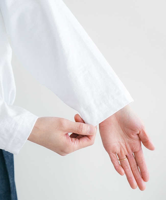 ・生地にはパフのような表面の小さな凹凸が肌に触れる表面積を少なくし、汗をかいても快適が続くパフ天竺を使用。