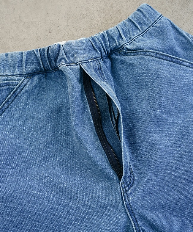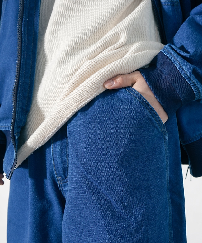 ・オーガニックコットンのダッククロスにインディゴ染めを施した粗野な生地。織フシやアタリによるムラ感が魅力です。