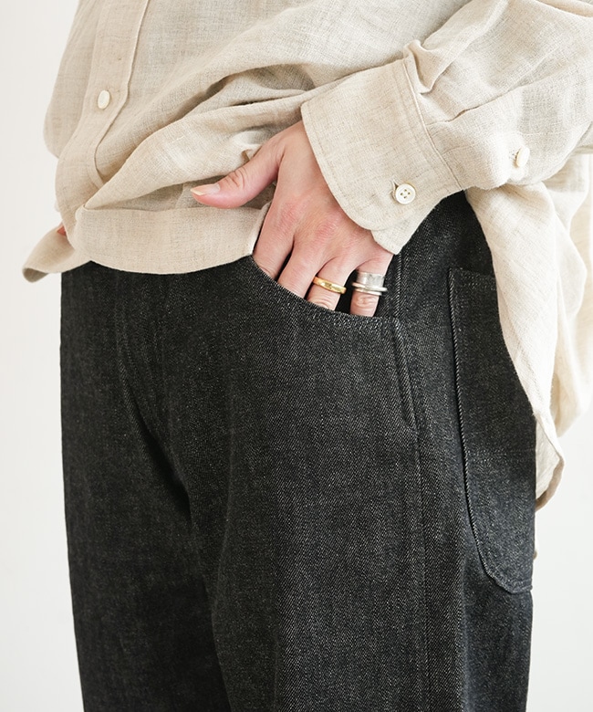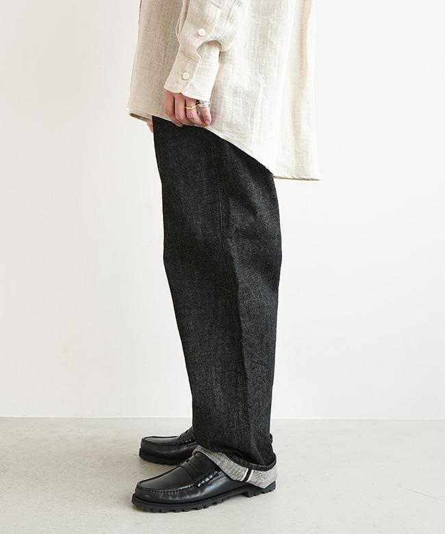 あえて大きめのウエストでベルトを絞って穿くことを想定しており、どんな体型の方でも好みのシルエットを作れるよう工夫されています。