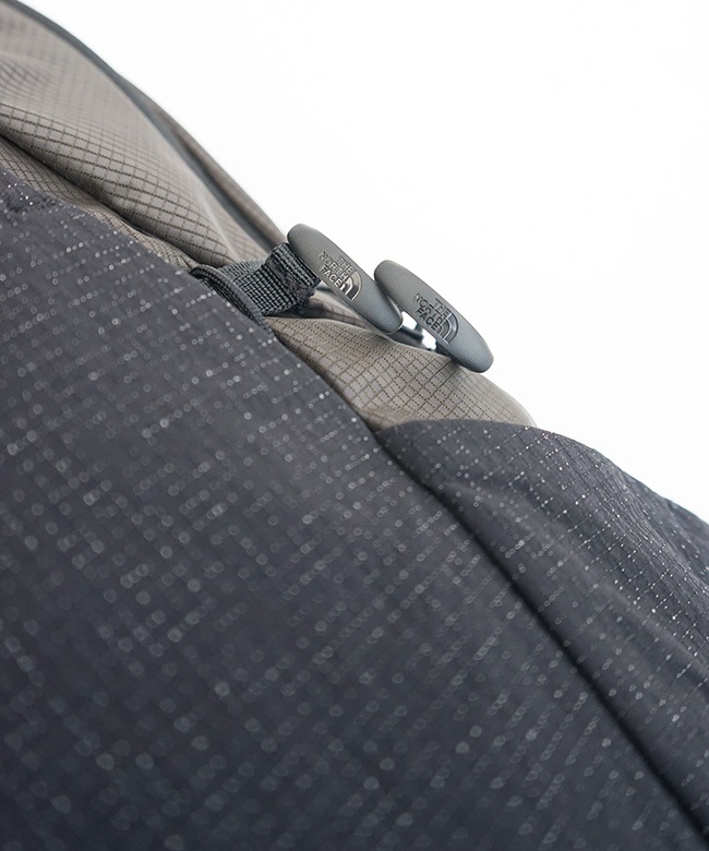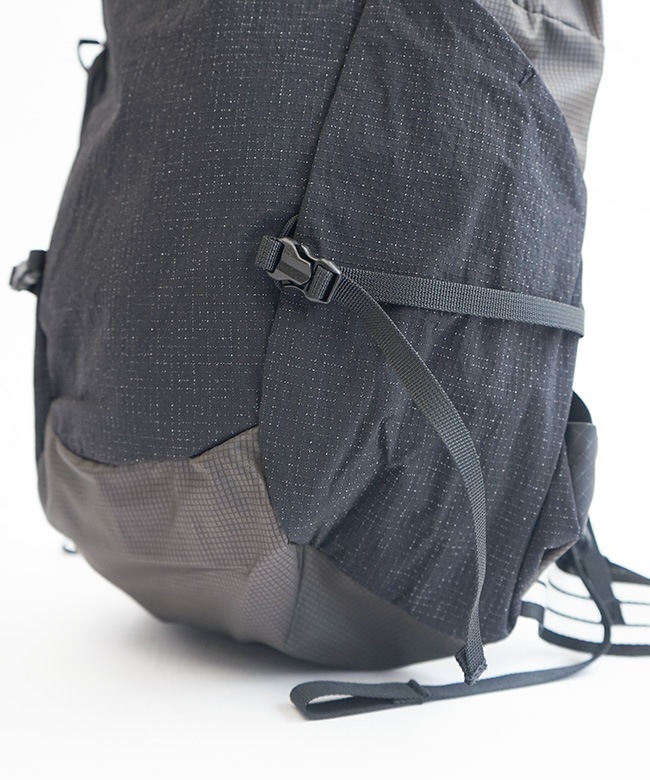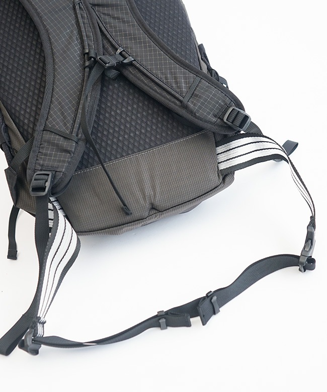 ・サイドコンプレッションベルト同士をつなげることで、フロントにシェルや軽量なスノーシューを外付け可能な仕様。