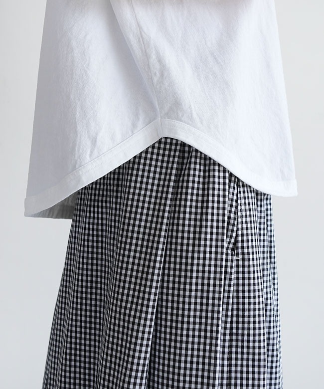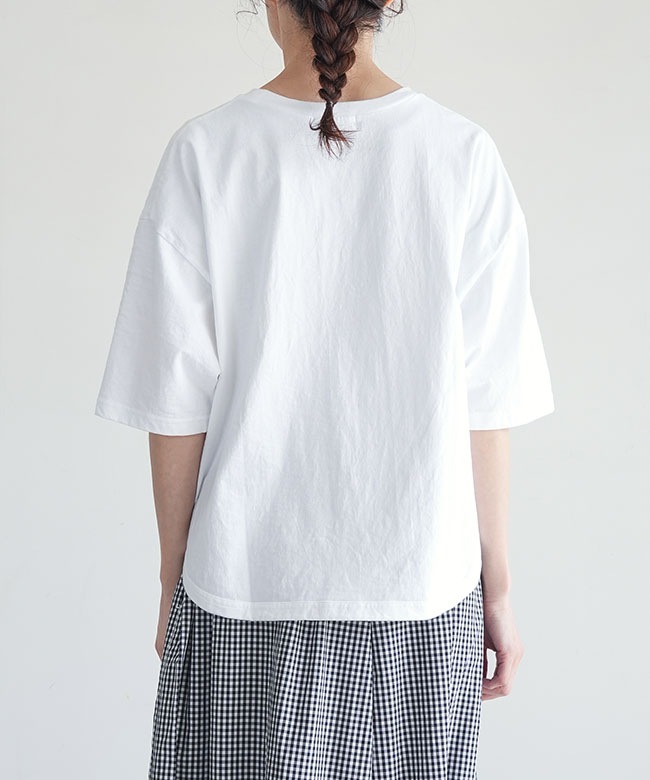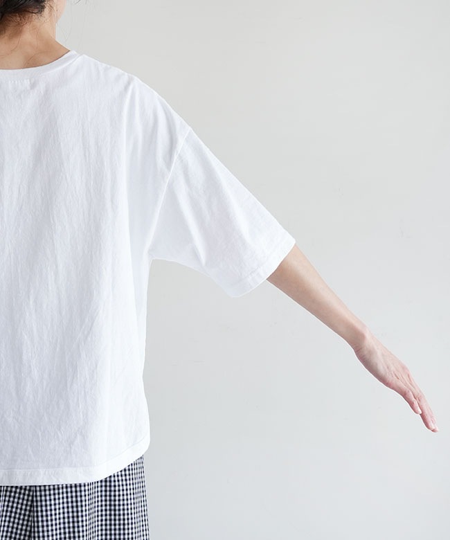 ・1枚で様になるラウンドヘムと、二の腕をカバーする五分袖。